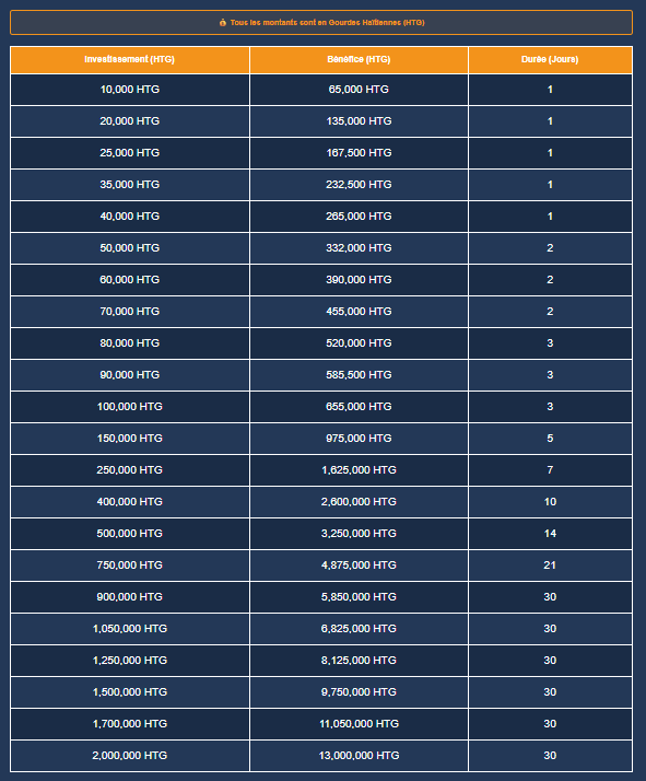 | Investissement (HTG) | Bénéfice (HTG) | Durée (Jours) |