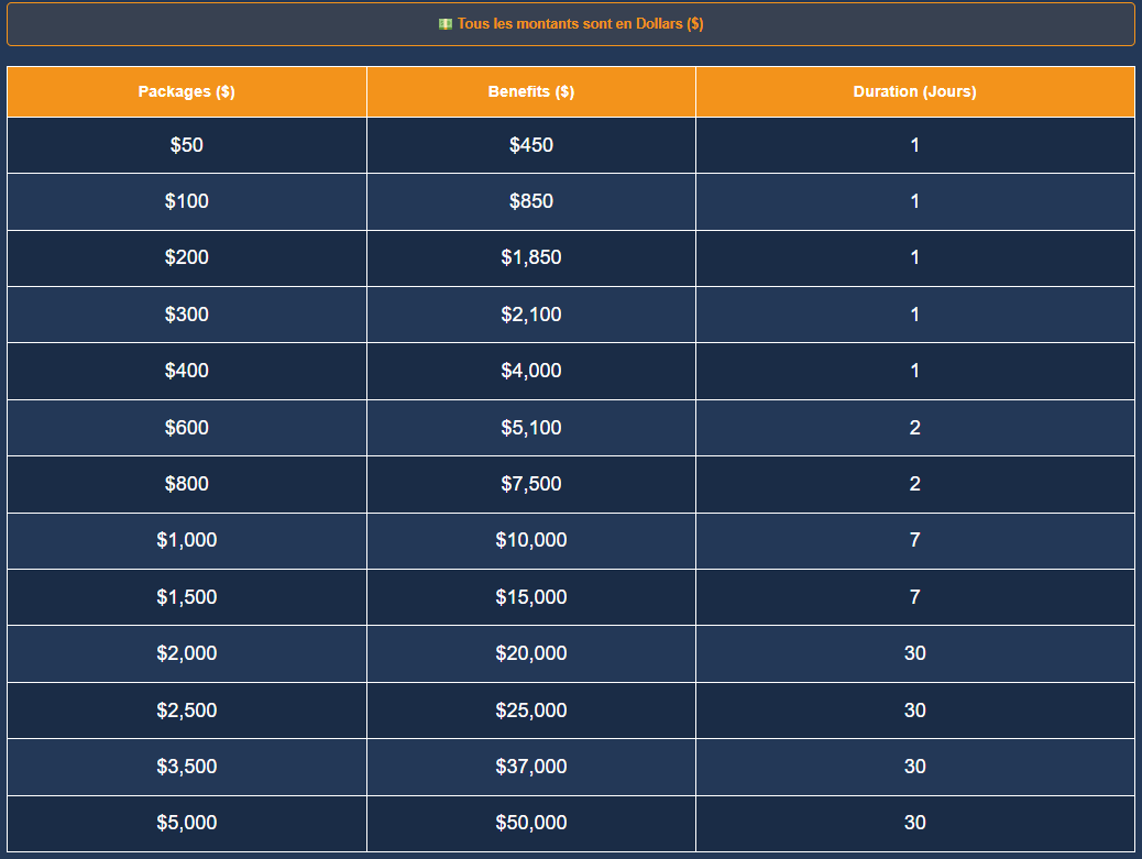 | Paquets (CFA) | Bénéfices (CFA) | Durée (H) | Jours |